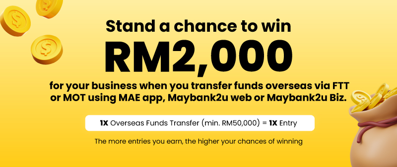 Whether you’re paying suppliers or sending funds overseas, stand to win a RM2,000 cash prize when you transfer a minimum of RM50,000 via the MAE app, Maybank2u web or Maybank2u Biz.